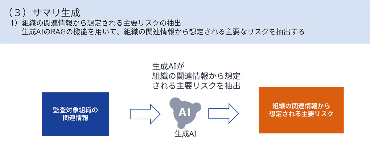 監査対象組織の関連情報(例:事業特性、業種、その他データ)から想定される主要なセキュリティリスクを抽出します。本プロセスでは、生成AIのRAG(Retrieval-Augmented Generation)機能を活用しています(図4)。