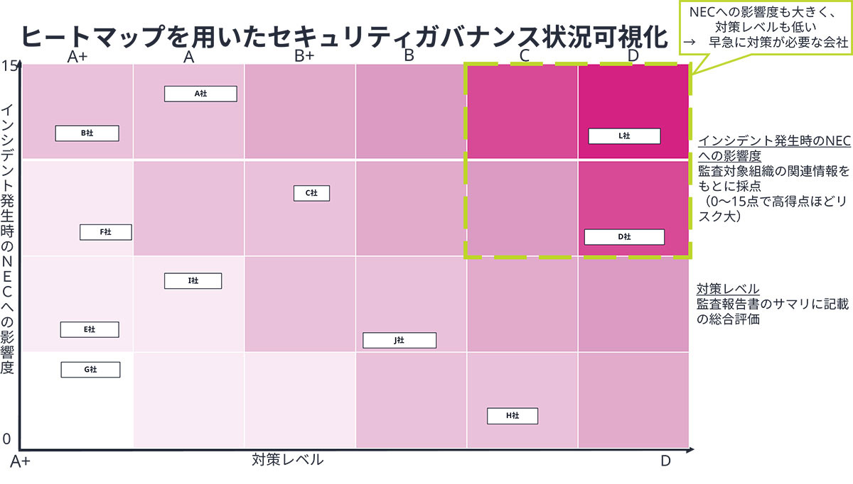 本ツールを活用したNECのセキュリティ監査活動では、監査対象全体のガバナンス状況がヒートマップにより可視化されています。