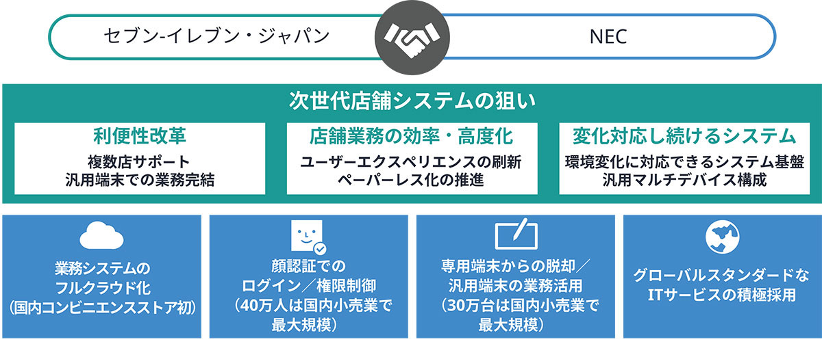 こうした状況のなか、NECはセブン‐イレブン・ジャパンとともに、店舗業務の効率化及び高度化を実現するため、業務システムをフルクラウドで構築しました。業務システムのフルクラウド化は、国内のコンビニエンスストア業界初の画期的な事例です。