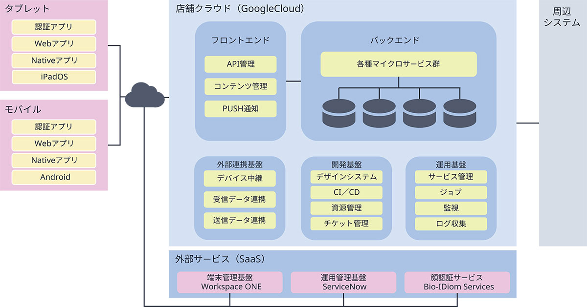 拡大するまた、次世代店舗システムでは、シームレスなログイン機能を実現する「認証認可」や30万台の端末管理基盤である「EMM(Enterprise Mobility Management)」、業務プロセスの標準化を図る「ServiceNow」の導入など、店舗システムを統合的に支える基盤を提供しています。