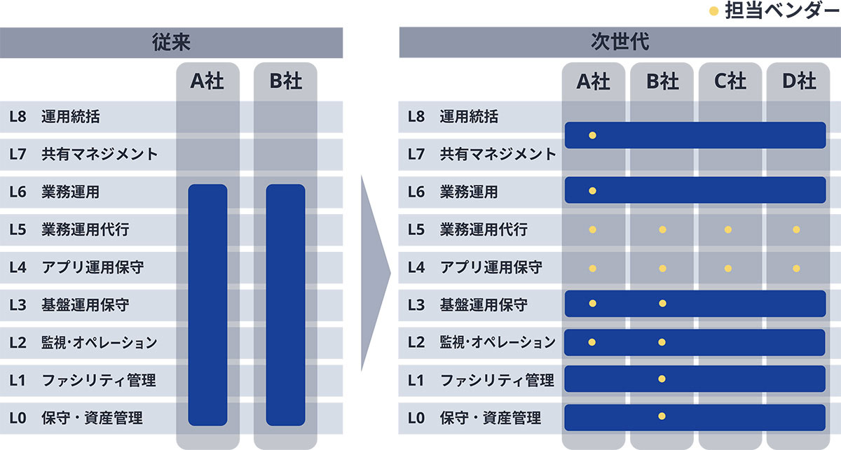従来のシステムは、ハードウェアからアプリケーション、そして現場保守に至るまで、単一のベンダーによる垂直統合型で提供されていたため、設計から運用まで一貫性を保ちやすいものでした。次世代店舗システムではクラウド化が進んだことにより、ハードウェアとアプリケーションが分離され、マルチベンダーによる水平分業型での提供となり、システム全体の統制や管理が複雑化することが想定されました(図3)。