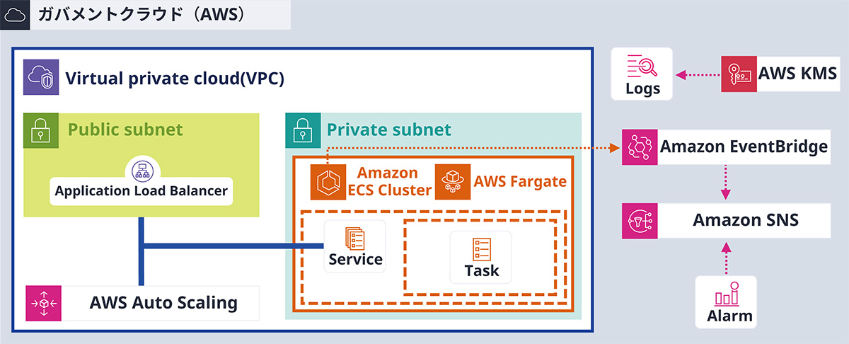 ガバメントクラウドでは、サーバを利用しないモダン化したアプリケーションが求められます。サーバレスやコンテナ化されたアプリケーションによるオートスケールによるコストの最適化やシステムの負荷への柔軟な対応など、クラウドのメリットを最大限活用することが推奨されます。このような場合に、図4に示すように「コンテナテンプレート」を活用することで、AWS Fargate/Amazon ECSを利用したサーバレスのコンテナの実行環境を素早く構築できます。