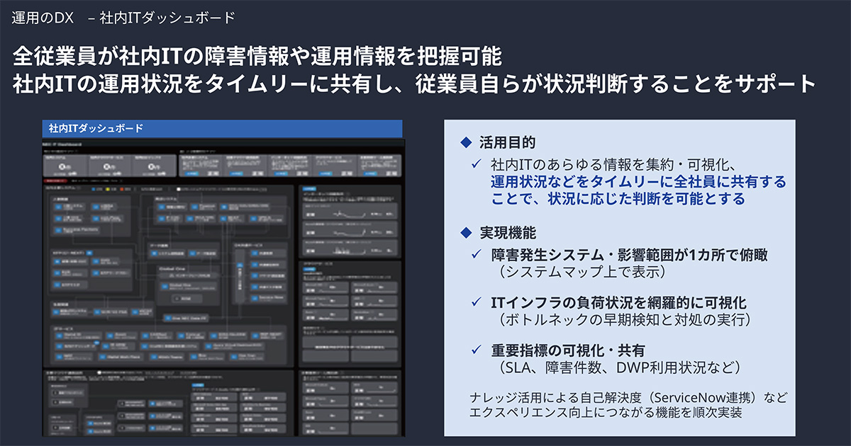 運用基盤の統一と並行して、IT運用状況のリアルタイムな可視化にも注力しました。その最たる施策が「ITダッシュボード」の全社員への公開です(図3)。これにより11万人規模の社員が自社システムの稼働状況、インシデント情報、リソース利用状況などをいつでも参照できる環境を整備しました。本施策により、可視化を起点とした組織横断の改善活動が加速し、次の効果を確認しています。