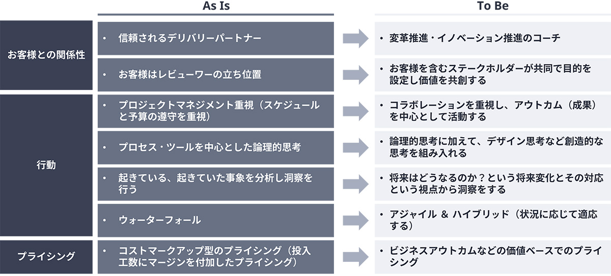 拡大する環境変化が激しい状況においては、解くべき課題を正しく定義することに加え、短期間かつ一定の完成度で課題解決策を立案し、解決策などのアイデアを市場で迅速に検証する必要があります。また、環境変化が継続するため、検証結果を基にプランを更新し、再度アイデアを検証してプランを更新するというサイクルを継続して回していく必要があります。このような活動を推進するために、顧客企業はコンサルタントのアウトカム(成果)を評価するという評価者という立場から脱し、信頼できるパートナーに伴走してもらう、もしくは信頼できるパートナーとともに価値を創造するといった関係性を求めるようになっています。