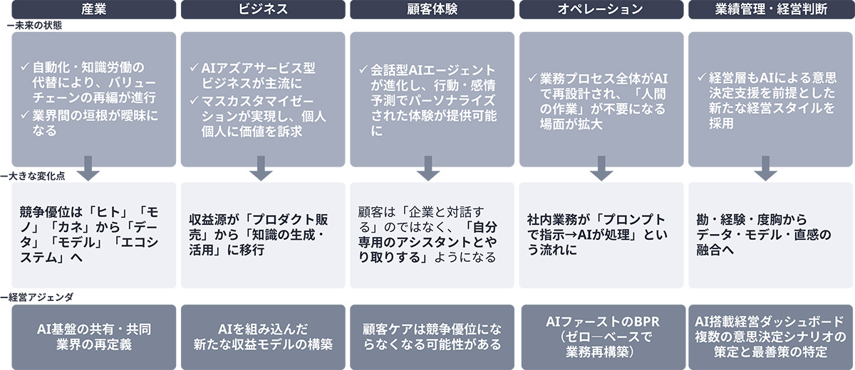 AIを組み込んだ新たな収益モデルの提供や、AI活用を中心に据えて業務をゼロベースで再構築すること、AIを搭載したダッシュボードを基に経営判断の高度化・効率化を推進することは、これからの新たな経営アジェンダとなっていくと考えられます。