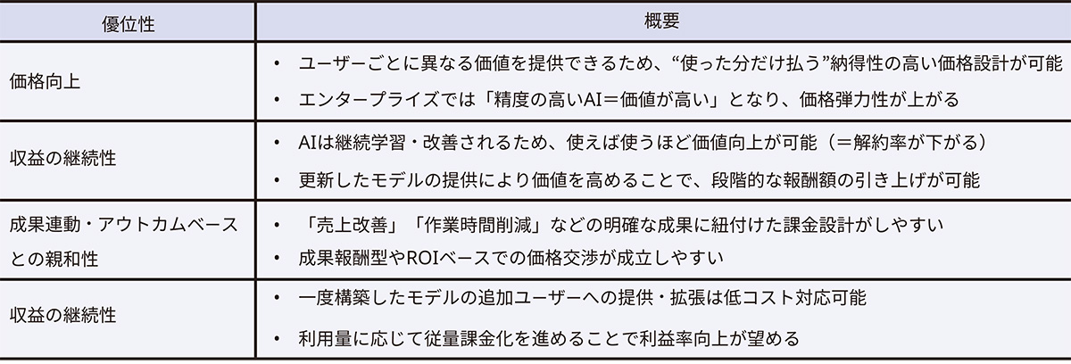 AIアズアサービスは、ユーザーごとに異なる価値を提供できることや、継続的な学習を通じてアウトプットの質を向上させることができるため、収益の継続や価格(価値)の向上が期待できます。また、成果に紐付けた明確な課金設計や、一度構築したモデルの機能拡張、低コストでの他への展開が期待できることにより、アウトカムベースのプライシングとの親和性が高く、拡張性にも優位性があります。
