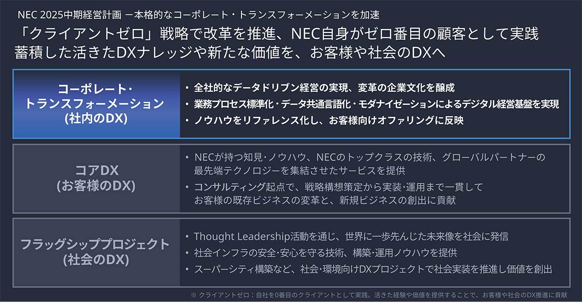 クライアントゼロ戦略により、NECは次の3つの柱で継続的な変革を実現しています。