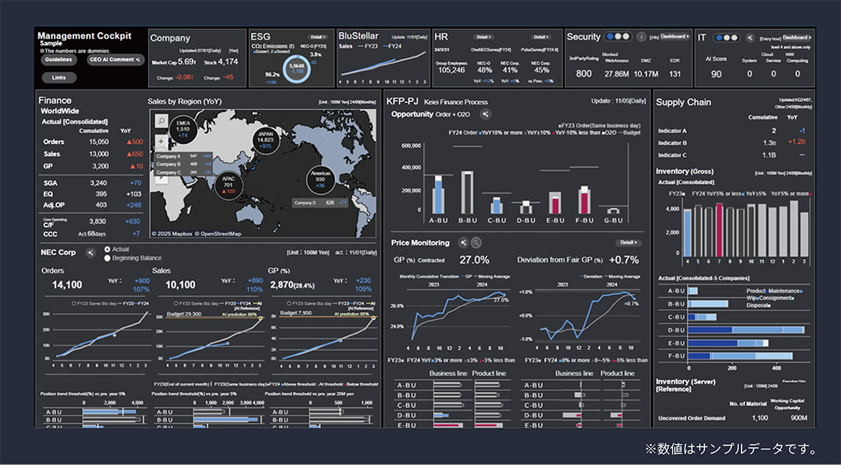 - (2)基幹業務のDX:データドリブン経営を実現し、ファクトに向き合いビジネスの根幹をなすプロセス変革を推進します。経営・ファイナンスプロセス刷新プロジェクト(KFP)による経営コックピットの実現など、データマネジメントの実践が含まれます(図4)。