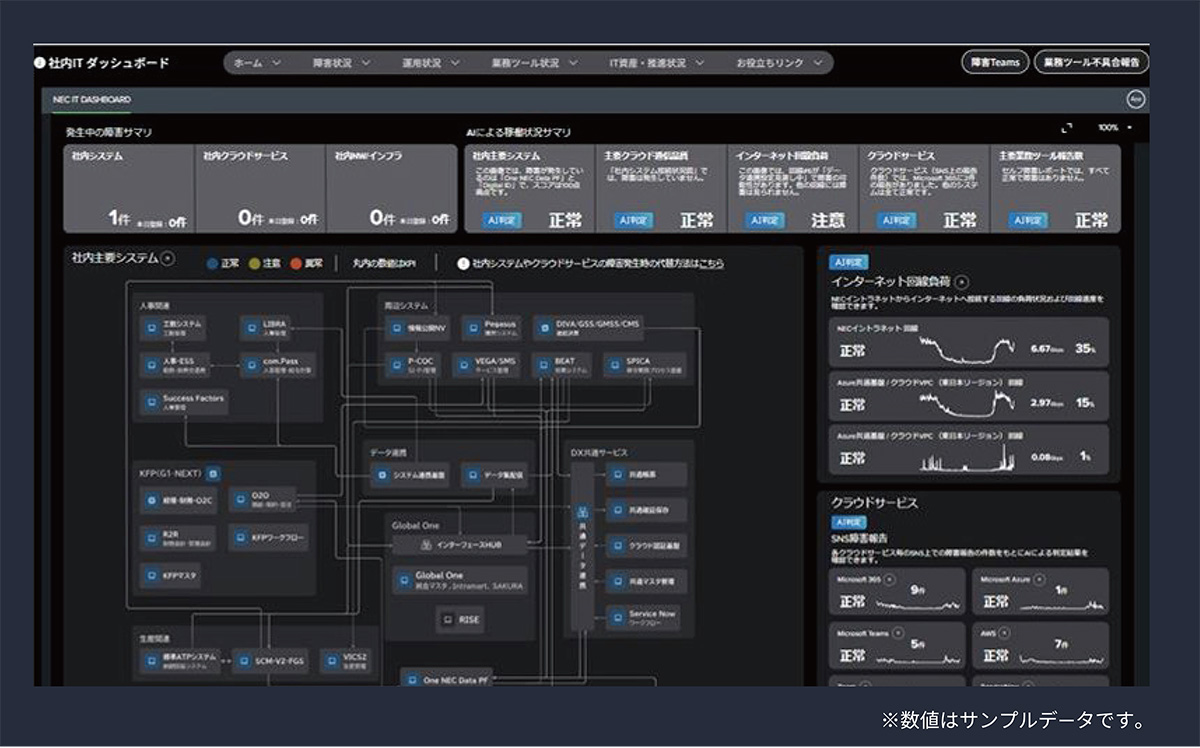 - (1)働き方のDX:デジタル活用で人の可能性を引き出し、全従業員の働きやすい環境とモダンワークを実現します。ここにはNEC開発の生成AI「cotomi」やOpenAI、Microsoft Copilotなどの活用による業務効率化・意思決定支援・ナレッジ活用が含まれ、AI活用の社内実践の場となっています(図3)。