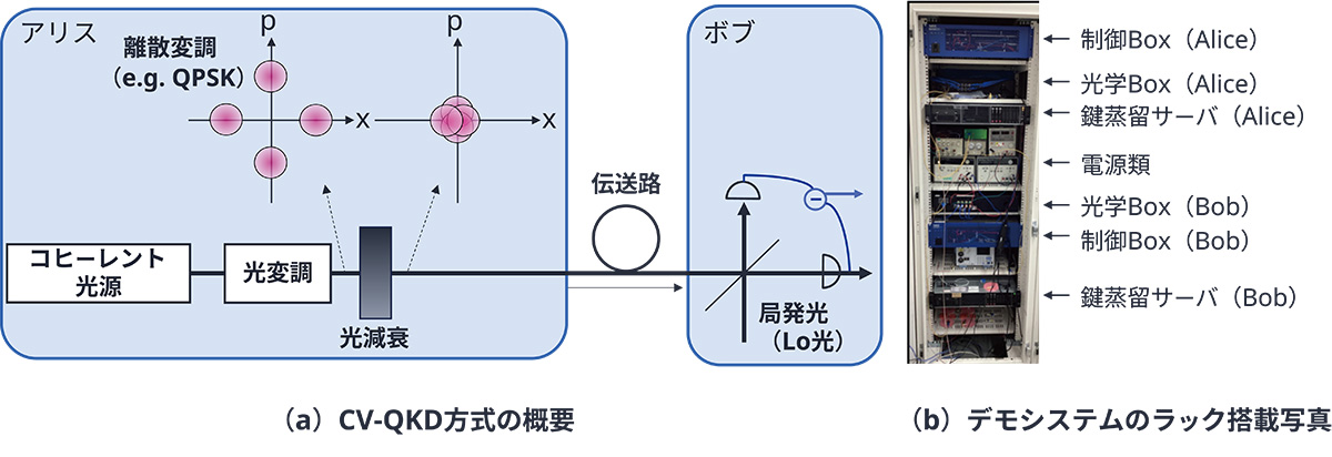 送信側(Alice)では光の直交位相振幅に鍵情報を変調し、微弱光として送信します。受信側(Bob)は局発光(LO光)との干渉で量子雑音限界に近い精度で直交位相振幅の測定ができます。微弱な光ではシンボル間の分布が重なり、盗聴者は原理的に完全な情報を取得できません。NECは、量子雑音限界に近い受信を実現するため、偏波多重デジタルコヒーレント伝送方式を採用し、参照信号とともに伝送して誤り訂正や秘匿性増強を施し、安全な最終鍵を生成しています4)。更に復調から最終鍵生成までをセミリアルタイム処理するデモシステムを開発し(図3)、連続的な鍵生成動作を実証しました。今後は処理スループット向上による鍵生成速度の改善や、小型・低コスト光トランシーバの実現が課題です。