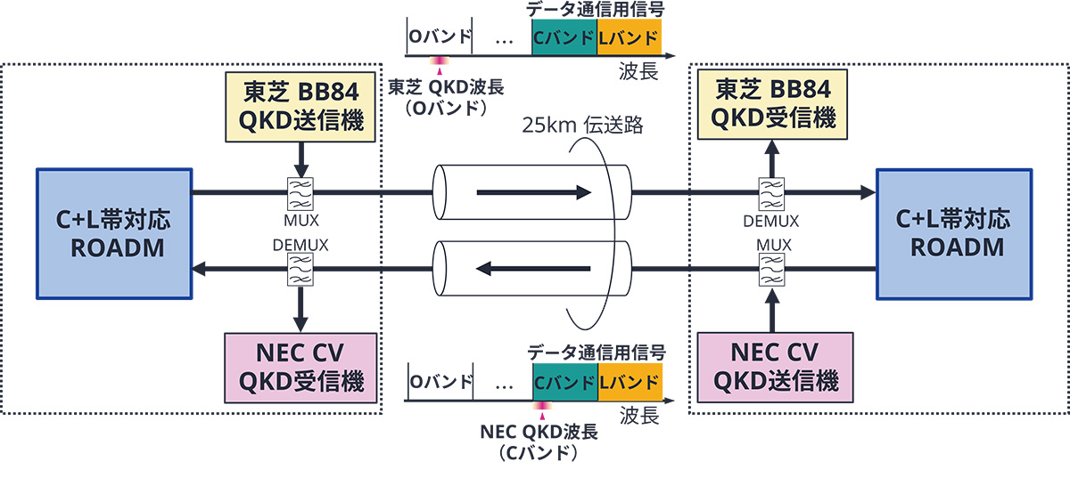 NECは東芝と連携し、通信キャリアの基幹ネットワークでの共存可能性を検証するため、C+L帯対応のROADMリンクを用いた実環境に近い構成を構築しました(図4)。NECのCV方式と東芝のBB84方式のQKD信号及び対応する制御信号を2芯双方向ファイバのそれぞれに収容し、C及びLバンドの全域に47.2Tbps相当のダミーデータ信号と波長多重をしました。その結果、8時間連続の同時鍵生成に成功し、更に、400Gbps/λ及び800Gbps/λの実データ信号をエラーフリーで伝送しながら、単一光子レベルのQKD信号と共存できることを実証しました5)。