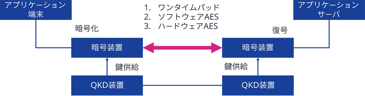 野村ホールディングス、野村證券、NICT、東芝、NECの5社が共同で、NICTがQKD装置を導入し構築した試験用通信ネットワーク環境(Tokyo QKD Network)上に、投資家と証券会社を模した金融取引の模擬環境を整備し、実際の株式注文の模擬データを用いてデータ暗号化した暗号通信の検証を実施しました。本検証では、暗号化方式として、ワンタイムパッド(量子暗号)方式とAES(Advanced Encryption Standard)方式の2種類を適用しました。ワンタイムパッドは通信データと同量の暗号鍵を消費するため、原理的に暗号鍵の消費量が増大します。そこで、暗号鍵の枯渇に備えてAESを併用する構成としています(図5)。暗号装置としてのワンタイムパッドの実装はNICTが担当し、NECはAESの実装にソフトウェアベースとハードウェアベースの両方を担当しました。また、暗号化を行うワンタイムパッド及びAESへの鍵の供給はQKD装置から行われますが、東芝とNECが装置を提供しています。実験結果からは、3つの暗号化方式を用いることで、量子暗号通信を適用しても従来のシステムと比較して遜色のない通信速度が維持でき、大量の株式取引が発生しても暗号鍵を枯渇させることなく、高秘匿・高速暗号通信が実現できることを確認しました。