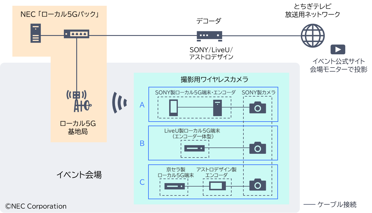 NECは、これまでも実証(注2)によりローカル5Gの有用性を確認してきました。今回の実証では、イベント会場(約100m×約150m)をローカル5Gネットワークエリア化し、ワイヤレスカメラに接続して映像データの圧縮を行います。また、ローカル5Gネットワークへ圧縮したデータを送信するローカル5G端末および映像コーデック装置を3種類(ネットワーク構成イメージ A,B,C参照)用意して、マルチベンダー環境を構築します。当日は、会場内を移動する3台のカメラからローカル5Gを利用して伝送した映像をイベント公式サイトでLive配信するとともに、会場内に設置したモニターへ投影し、リアルタイム、かつ安定した映像伝送に支障が無いかを検証します。