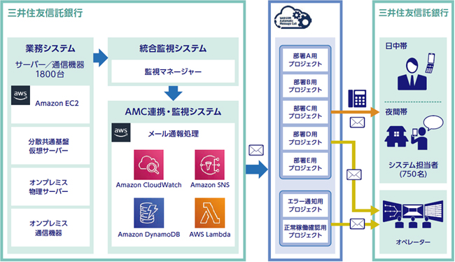 三井住友信託銀行株式会社様(以下、SuMiTB様)には、クラウド、オンプレミス含めて約1,800台のサーバ/ネットワーク機器で構成される200を超えるシステムが存在します。各システムからは、統合監視を行う監視マネージャーへ、多種多様なアラート情報が日々届いています。