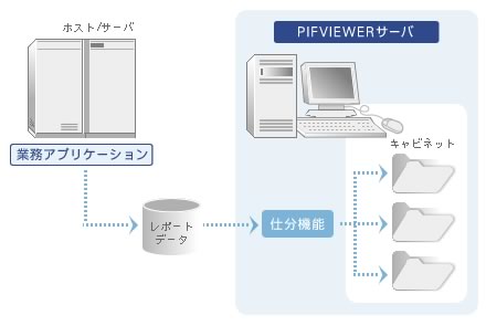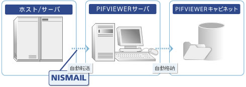- 上位ホスト/サーバからのレポートファイルの転送をトリガーとして形式変換→キャビネットへの格納を自動的に行います。転送ツールとしてNISMAIL(注1)をご利用いただくとデータ転送の確実性が向上します。