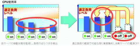 - 仮想マシンサーバの負荷状態のばらつきを検出し、可能な限り少数の仮想マシンサーバ上に適正負荷の範囲で業務を自動集約。 この結果生じた余剰サーバをシャットダウンすることで省電力運転を図ります。