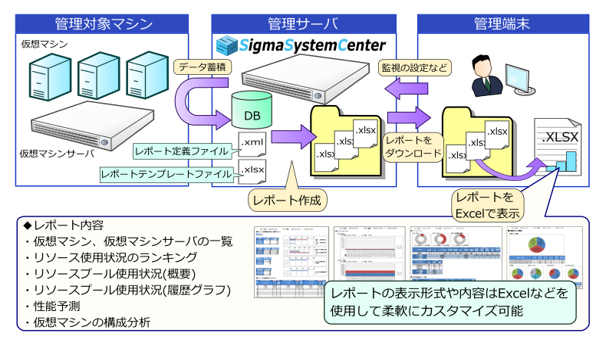 運用中にSigmaSystemCenterに蓄積された情報からxlsx形式のレポート文書を生成することができます。生成したレポート文書は、Microsoft Excelにより閲覧・印刷を行うことができます。