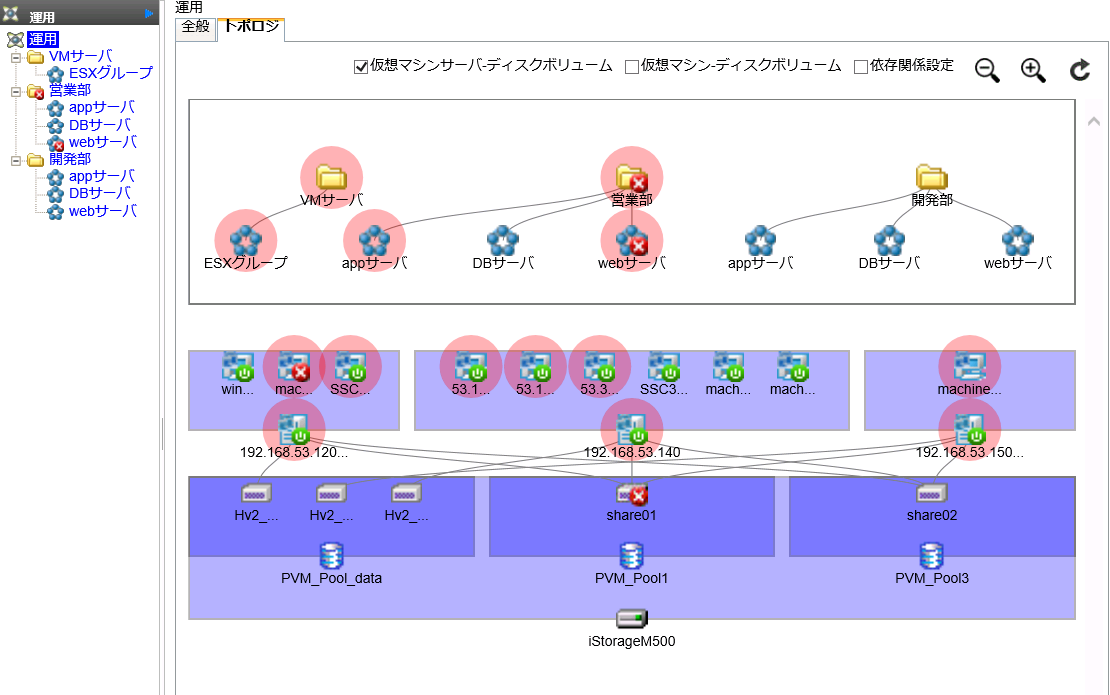 マシン、ストレージ、ネットワークスイッチなどのリソースと仮想環境、および運用グループなどのSigmaSystemCenterが管理するシステム構成を、トポロジ機能により、一元的に表示できます。システム内の障害箇所とその障害が影響を及ぼす範囲を、トポロジにより即座に把握できます。