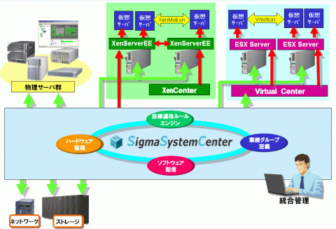 VMware、Citrix XenServer、Windows Hyper-Vの統合管理が可能です。