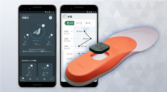 インソール一体型の歩行分析センサで、研究室内ではなく日常の無意識下の歩行状態をデータ化。