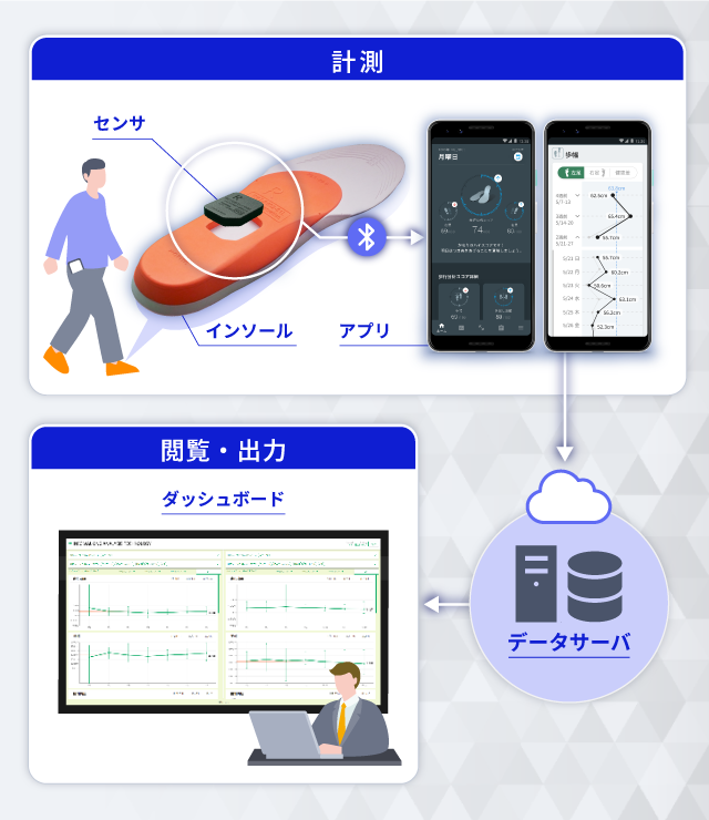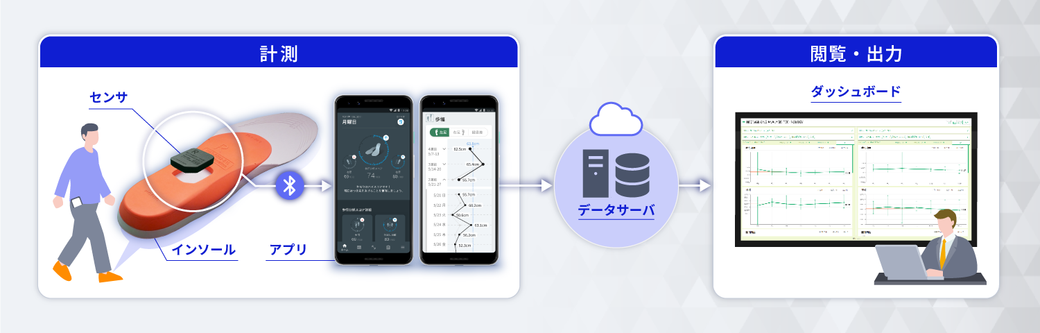 センサから取得したデータはスマホアプリで見える化、法人向けダッシュボードで複数利用者のデータの閲覧・出力が可能です。