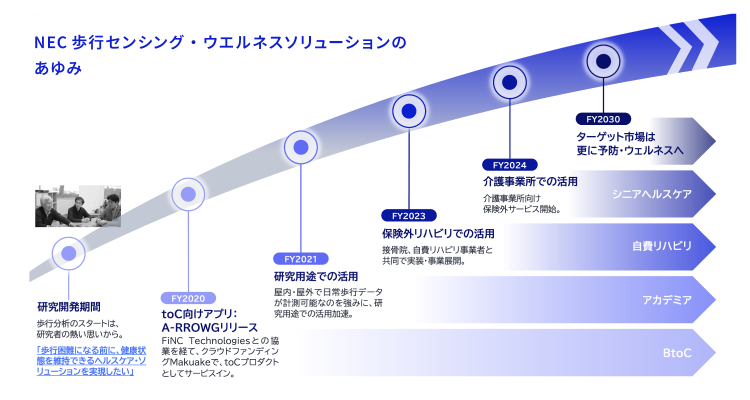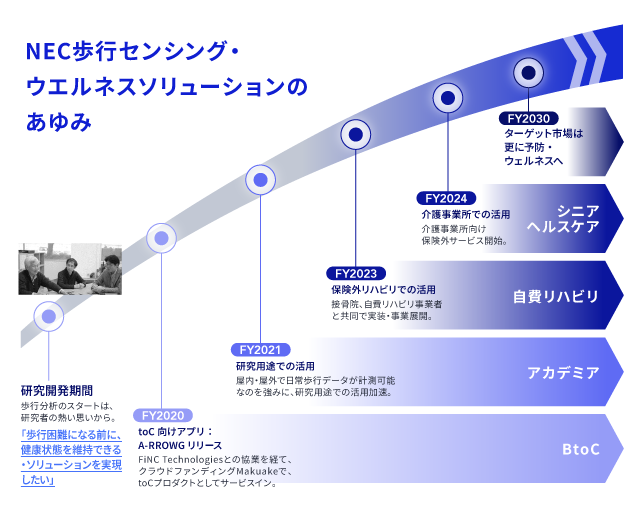 NEC歩行センシング・ウェルネスソリューションでは、6軸慣性センサを用い、歩行の質や、そこからAIが推定した項目を20以上計測することができます。